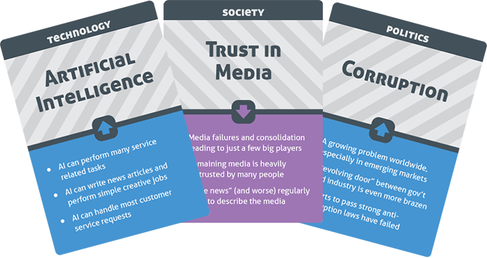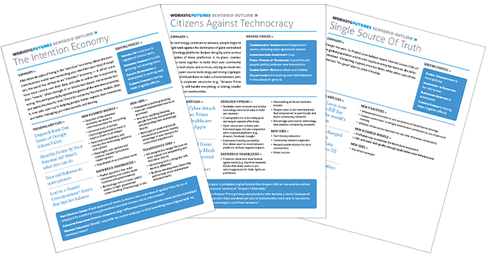 As part of this process, we developed a scenario-planning card game that helps design future scenarios based on technological, economic, political and cultural driving forces. You can order your own copy of the custom Working Futures card deck below, or contact us if you're interested in running a scenario-planning event.